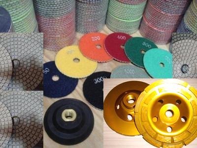 9 Pcs of 4" Diamond Polishing Pad (3mm Thick) for concrete stone and 1 backer.9 Pads are: 1 X Grit 30 50 100 200 400 800 1500 3000 10000Super buff.1 Pcs Rubber Backer (5/8" Thread arbor). Backer has water feed hole, wet polishing no problem.Remind: Velcro Backer's max capacity is 5000RPM. Please don't use it with high speed grinder.1 Piece of 4.5" Diamond Double Row Grinding Cup Wheel (5/8" Thread arbor).