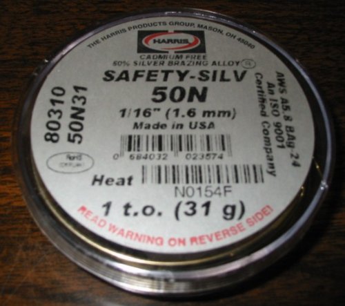 Harris silver brazing alloys are produced with precise wire size and chemical composition. Safety-Silv brazing alloys are offered in coil, straight lengths, and bare or flux coated rods. To protect the health of operators the use of cadmium-bearing filler metals should be discontinued. Cadmium oxide fumes produced during brazing operations are highly toxic and a listed carcinogen. Harris offers no silver brazing alloys containing cadmium.SAFETY-SILV 50NThis 50% silver alloy is a good replacement for the 3% nickel, cadmium alloy (AWS BAg3). It is especially helpful where low brazing temperature must be maintained. It can be used to braze tungsten carbide, stainless steel, as well as other steel, copper, and nickel alloys.Silver-50%, Zinc-28%, Copper-20%, Nickel-2%.Solidus 1220 degrees FLiquidus 1305 degrees FFluidity rating 7AWS A5.8 Class BAg-24
