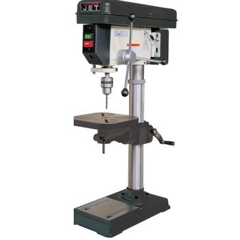 This JET 16-speed drill press has a 115V, single-phase motor. 16 spindle speeds ensure proper application for a variety of different jobs. Large quill allows for greater accuracy. Head casting features a permanently lubricated ball bearing spindle assembly, with four heavy-duty ball bearings in an enclosed quill for longer life. Speeds (qty.): 16, 360deg Head Swivel: Yes, Chuck Size (in.): 5/8, Dimensions L x W x H (in.): 26 x 14 x 39, Volts: 115, HP: 3/4, Speed (RPM): 200-3,630, Stand Included: No, Worktable L x W (in.): 10 x 10, Swing: 15 in., Vertical Stroke: 3 1/8, Drilling Capacity (in.): 5/8 cast iron, Draw Bar: No, Light Included: No