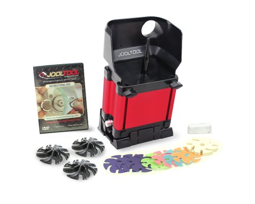 The JoolTool has a compact, durable aluminum and impact-resistant ABS body, and a hood that can be removed for additional clearance for working on larger items. The Jooltool has a side handle and can be undocked/detached from its base to allow freehand sanding and polishing of large objects and surfaces. It also can be mounted horizontally on its base for classic buffer-style finishing and polishing. A dust collection system can be attached to the hood's vacuum port for removal of dust and debris from the grinding area for safety visibility. The JoolTool occupies less than one square foot on a tabletop or bench. A wide range of accessories are available for this tool (sold separately) that expand its use for professionals and hobbyists working in lapidary, jewelry making, woodworking, tool sharpening, and many other fields.