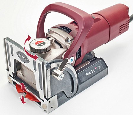Top 21 is Lamellos top of the line biscuit joiner with all the features. It is the only biscuit joiner in the world with a repeatable adjustable blade height and stop square that mounts on the bottom for support when joining near the end of a surface. The Top 21 features a new baseplate that is ground square so it can be used as a reference point and slots can be cut right up against another workpiece. The new stop square mounts in an internal dovetail slide making it extremely precise. The machines powerful 800w Smart motor is electronically controlled for soft starts, maintaining proper RPM in all types of materials, and overload protection. All referenceable surfaces are CNC machined vs. cast for extreme precision and repeatability over years of service. The Top 21 comes with an integrated dust bag, 6 tooth carbide scoring cutter in a handsome wooden carrying case.