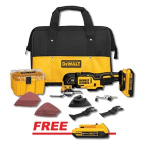28pc DeWalt accessory kit includes popular cutting and sanding attachments. Includes: DCS355 20v MAX XR Oscillating Tool, DCB203: 20v MAX XR Compact Li-Ion Battery (2.0Ah), fast charger, DeWalt Oscillating Tool Guide System, Wood with nails blade. 1 year Free Service Contract. FREE MAX Compact XR Lithium Ion Battery Pack, 20V (DWT-DCB203) .
