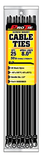 Pro Tie screw mount cable ties are made from high strength and lightweight 6/6 nylon. Nylon 6/6 is a hygroscopic material, which absorbs and releases moisture, is non-toxic and has a working temperature range of –40 to 185° F (-40 to 85° C). Pro Tie UV black cable ties are UV stabilized for outdoor use. Using a #8 or #10 wood, sheet metal, or concrete screw, fasten the bundle directly to walls, panels, automotive chassis, or any other surface you desire.