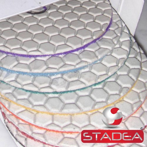 4" Premium grade Diamond polishing pad Dry (STADEA Super A) 7 Pcs set (One piece each of Grit 50, 100, 200, 400, 800, 1500, 3000) for Granite, Marble, Concrete, Stone, Granite Tile, Glass etc polishing. These diamond polishing Pads are aggressive and suitable for any kind of natural or artifical stones like Granite, Marble, Concrete, Terazzo, Travertine and glass etc. It is flexible and can polish either contoured surface like Ogee, Full Bullnose, Half Bullnose, Bevel, Demi or flat surface. Dry polishing pads can be used on low speed grinders or variable speed grinder or polishers. Dry diamond polishing is suitable for onsite or post-installation polishing need. Typically wet polishing creates watery mess and could have challenges perforning wet polishing on site / post-installation. Dry polishing is easy and quick way to polish stone without any watery mess. It does generates dust, nasal protection is required during dry polishing. In general polishing starts with grit 50 diamond polishing pad, and is consumed more than higher grits diamond polishing pads. FAQ: 1) Can I use STADEA Super A dry polishing pads for Wet Polishing. Ans: Yes. STADEA Super A dry polishing pads are designed for dry polishing to dissipate heat faster and keep the temperate of polishing surface low. It can equally well be used for wet polishing.