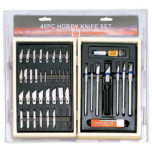 Cover all your hobby needs with this vast set of blades. From intricate details to rough cuts, this set has it all: 6 handles, a variety of 41 blades (ranging from straight edge, slant, curve, pin blade, punch/awl, graduated, and more), glue and polishing stone. Features: Use to cut, scratch, etch, scrape, layout, and make models Each blade, handle, and stone has its own recessed holding place in case 35 different kinds of blades 7 different blade handles Sharpening stone Super glue Quality wood flip lock storage case